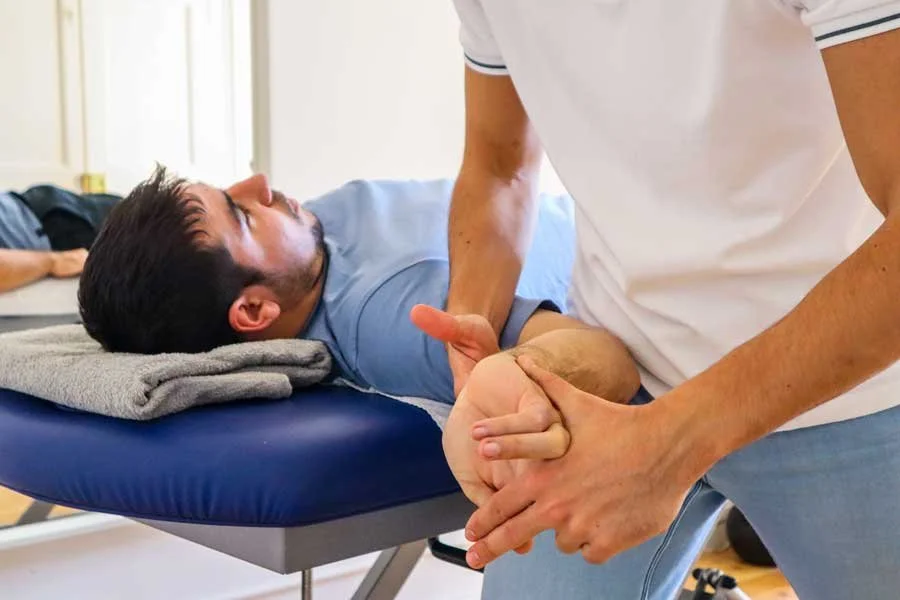 Uso de las manos y ayuda del cuerpo para realizar maniobras de liberación del dolor en articulaciones con restricción de movimiento que cursan con dolor.